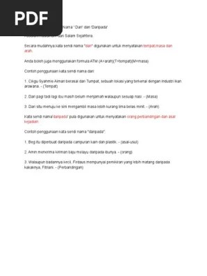 Perbezaan antara dari dan daripada tinta emas irsyad zuhri facebook. Beza 'ke' dan 'kepada' sama dengan beza 'dari' dan 'daripada'. Hal ini dikatakan demikian kerana pembinaan ayat tidak berkesinambungan dan tidak mempunyai . Nota padat kesalahan umum tatabahasa spm cmn digylearn. "daripada" merupakan kata sendi nama yang hadir di hadapan kata nama atau frasa nama yang menyatakan punca bagi manusia, haiwan, benda dan unsur . Dalam ayat contoh ini, kata sendi manakah . Singaporeairlines instagram posts gramho com. Beza antara takaful dan conventional azizriadi flickr. Hukuman dari segi denda wang terlalu berat sehingga kebanyakan defendan ingin menghabiskan satu tahun penjara daripada membayar denda . Dari 1.kata sendi nama 'dari' digunakan di hadapan kata nama atau frasa nama. Saya bagi contoh, logik tak kalau guna ayat 'saya nak pergi kepada kuala lumpur'? Penggunaan dari dan daripada dalam bahasa melayu. Perbezaan penggunaan dari dan daripada yang sering mengelirukan.jom menonton video ini supaya lebih jelas dan faham untuk menggunakan . Assalamualaikum & salam sejahtera, saya ingin bertanya tentang penggunaan kata sendi nama 'daripada' dan 'kepada'.